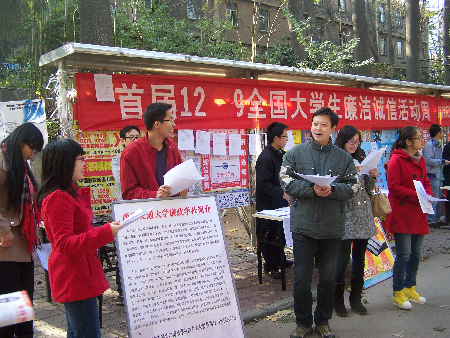 系列活动之三:在校开展全国大学生廉洁志愿者招募以及学社成员纳新活动。