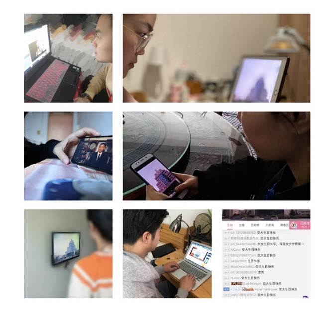 硕9106、9107支部孔芸、蒋金桂在云升旗国歌声响起时,便回忆起刚入校在涵英楼前升旗时清晨的阳光,袅袅的薄雾,和那庄重的做西迁精神传人的誓言,那是青春和使命的味道。六十四年前,交大和交大前辈们一起从黄浦江边来到了三秦大地,扎根祖国西部;六十四年后,面对突如其来的新冠疫情,交大人再一次挺身而出,奋斗在一线。交大人用行动证明了国家需要时交大人从不缺席的事实,彰显了交大的家国情怀、使命与担当,践行了每一个交大人牢记于心的西迁精神。从来都为自己是交大人而感到自豪,努力在这个最爱的学校寻找到最好的自己。疫情并不阻隔交大学子与母校的联系,想对交大说一声,“生日快乐”。