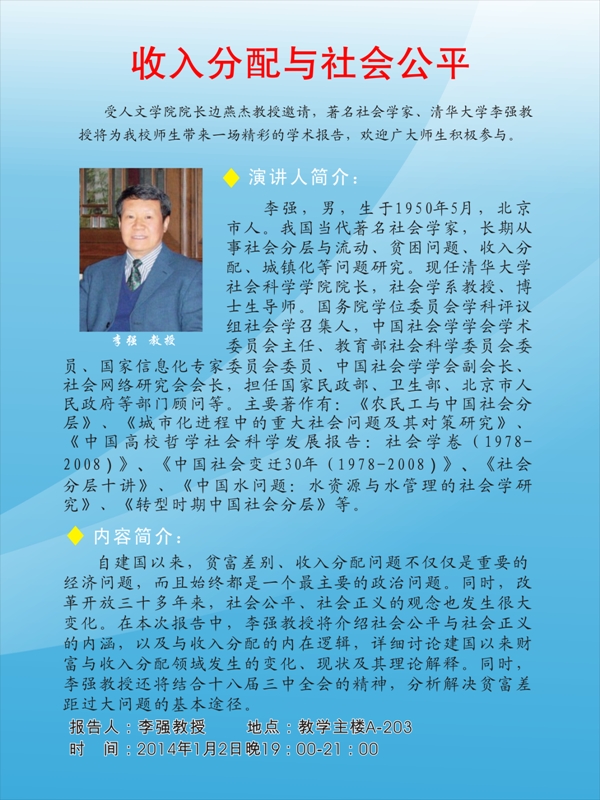 学术报告会通知:收入分配与社会公平——清华大学李强教授