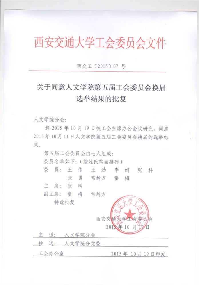 经2015年10月19日校工会主席办公会议研究,同意2015年10月11日人文学院第五届工会委员会换届的选举结果。 现将审批选举结果的文件公布如下,详见附件。