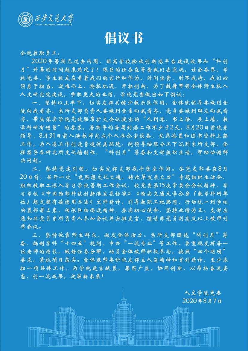 2020年暑期已过去两周,距离学校验收创新港平台建设效果和“科创月”开幕的时间越来越近了!艰巨的任务在等着我们去完成,社会各界、学校党委、学生校友在看着我们的言行和作为,时间宝贵、时不我待,我们必须勇于担当、迎难而上、抢抓机遇、开拓创新,为了鼓舞带领全体师生投入人文研究院建设,争取更大的业绩,学院党委做出如下倡议: