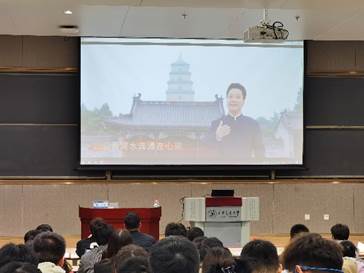 李老师还深入探讨了秦文化,从狭义和广义两个层面分析了“秦”的民族精神和美学思想。他指出,秦人的内核是军人风骨、忠厚仁义的血性男儿,这种精神在表现古秦国军民共御外侮、同仇敌忾的战歌《诗经·秦风·无衣》中得到了生动的体现。通过现场演播李老师的创新作品《人面桃花》,现场表演戏剧中的“上马骑马”“开门掩门”的身段动作及表情达意,李老师为同学们生动演绎了中国传统戏剧之虚实相生、意在言外、抒情写意的美学精髓。