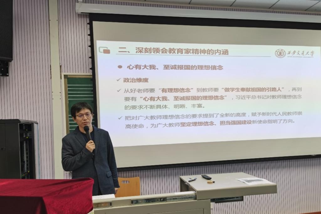段恒强围绕“以西迁精神为底色、教育家精神为引领,以涵养高尚师德为己任,全面提升教师党建和思想政治工作质量”这一专题,从党的十八大以来党中央关于教师队伍建设的系列重要工作部署为出发点,强调了加强师德师风建设,打造一支师德高尚、业务精湛、结构合理、充满活力的高素质专业化教师队伍的重要意义。他从政治维度、师德维度、育人维度、治学维度、爱心维度和国际维度六个方面系统领学了教育家精神的深刻内涵。并通过稳固制度建设、坚守第一标准、突出正面引导、做好服务保障等几个方面介绍了学校在师德师风建设方面具体开展的工作。最后,详细解读了《普通高等学校教师党建和思想政治工作质量标准(试行)》,为学院加强教师党建和思想政治工作提供了具体建议。