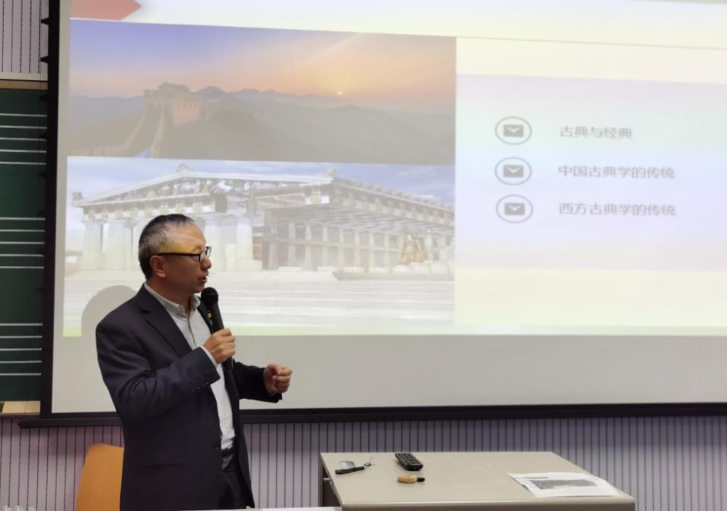 常新介绍了首届世界古典学大会并带领大家共同学习了习近平总书记的贺信内容。他通过深刻阐释文明的冲突对社会发展的影响、民族复兴的中国梦以及全球化浪潮对中国发展和世界格局的影响,强调了召开此次会议的重要意义。通过分析如何处理好古典和经典之间的关系问题、对比中国古典学和西方古典学的传统,回答了古典学是什么的问题。强调了中西文明的发展都受到古典学的重要影响,如何将古典学的传统和现代社会转型衔接好是我们需要思考的。最后,提出要通过致敬经典、博采古今、融通中外的方式,返本开新,构建具有中国特色的知识体系和文化体系。通过对古典学的追溯,发掘传统文化古典学说的精神要义,并通过转化创新来解决当今社会思想、观念、行为方面存在的问题,进而为构建人类命运共同体和推动人类社会的历史进步贡献中国力量。报告为指导学院广大教师进一步增强文化自信、充分领会此次国家举办世界古典学大会背后的深意提供了学理依据,同时为进一步增强广大教师在教学科研过程中推动马克思主义的“两化两结合”提出了具体指导。