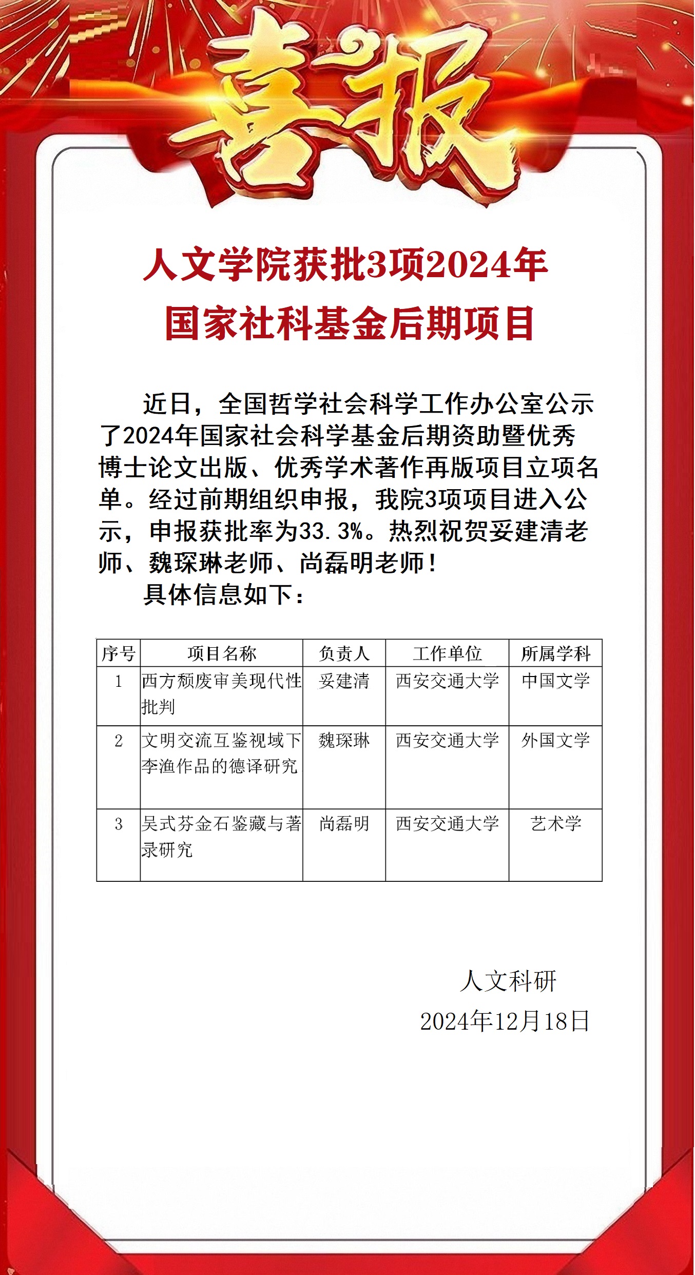 【喜报】人文学院获批3项2024年国家社科基金后期项目