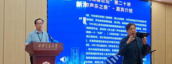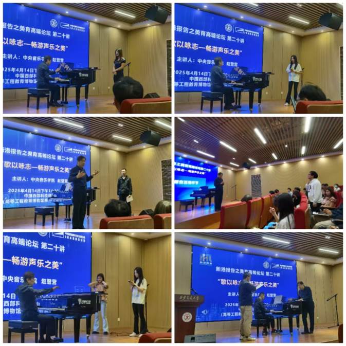 研究生院、档案馆、博物馆、人文学院主办的新港报告之美育高端论坛第二十讲在创新港高等工程教育博物馆美育多功能报告厅火热开讲。著名低男中音歌唱家,声乐教育家,中央音乐学院二级教授赵登营先生为交大学子带来题为“歌以咏志——畅游声乐之美”的美育论坛,吸引了近200名校内外师生现场聆听。校党委常委、副书记王欢,档案馆、博物馆馆长吕青,后勤保障部副部长巩滨,研究生院副院长龙建纲,校团委副书记毕晓楠,人文学院副院长张勇受邀作为嘉宾参与本次论坛。