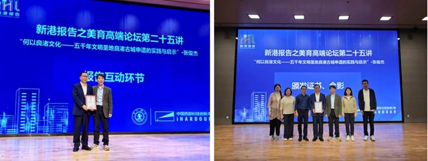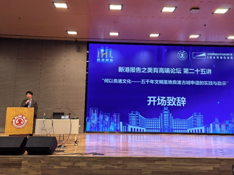 研究生院主办、人文学院承办的“新港报告之美育高端论坛”第二十五讲在创新港校区涵英楼报告厅成功举办。本次论坛以“何以良渚文化——五千年文明圣地良渚古城申遗的实践与启示”为主题,特邀良渚古城遗址申遗指挥部总指挥,原浙江省良渚遗址管理局局长,杭州良渚遗址管委会党工委书记、主任,同时也是浙江省委省政府“良渚古城遗址申遗卓越贡献个人”获得者的张俊杰担任主讲嘉宾。讲座由人文学院副院长张勇主持,人文学院社会学系主任卢春天等出席活动。