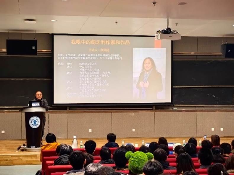 创新港校区涵英楼报告厅成功举办。本次论坛以“跟我走进两位匈牙利诺奖作家的文学世界”为主题,特邀余泽民教授担任主讲嘉宾,余教授是旅匈作家、匈牙利语翻译家,中国作家协会会员。他先后翻译包括2002年诺奖作家凯尔泰斯、2025年诺奖作家克拉斯诺霍尔卡伊多部作品在内的近三十部作品,被匈牙利政府授予“匈牙利文化贡献奖”,被称作“当代匈牙利文学的中国声音”。人文学院副院长张勇担任主持人,人文学院党委书记纪梦然、中文系主任王瑶和教师代表出席,全校各学院同学积极参与。