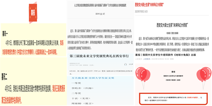 金奖、银奖等多个奖项,1名学生获得“未来科幻大师奖”。本科生李昀齐在第三届“致未来文学奖”中获得“大学生长安主题征文”一等奖。牛煜琛(指导教师王瑶)的“国家科普科幻IP‘地球大龟裂’孵化项目”入选陕西省第七届研究生创新成果展高质量成果。