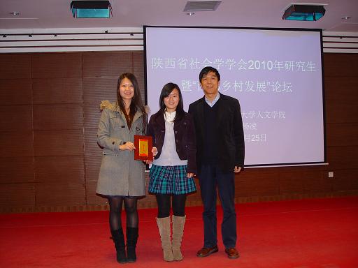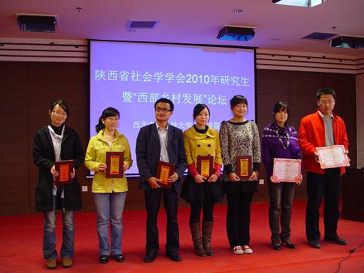 王夏峥、陈煜婷同学的《城乡家长教育期望现状分析》一文荣获大会一等奖,程诚、邢瑞雪同学的《第二代农民工市民化途径实证研究》一文荣获大会二等奖,肖阳、孙坚同学的《农民工自我社会认同研究》一文荣获大会优秀奖。与会专家对获奖者进行了颁奖。陕西省社会学会2010年研究生论坛暨“西部乡村工作坊”第一次学术交流会圆满结束。