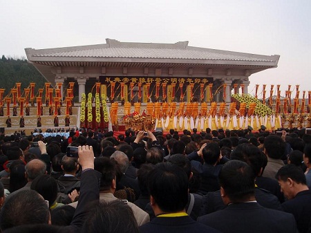 天地祥,紫气腾,四海华裔,同祭黄陵。2011年4月5日上午,辛卯(2011)年清明公祭轩辕黄帝典礼在陕西黄帝陵隆重举行。全国人大常委会副委员长、民进中央主席、中央社会主义学院院长严隽琪,中国国民党荣誉主席吴伯雄,陕西省委书记、省人大常委会主任赵乐际,宁夏回族自治区党委书记、自治区人大常委会主任张毅,陕西省省长赵正永等领导及海内外一万多名中华儿女代表出席。人文学院卢黎歌教授、韩鹏杰教授、黎荔副院长、燕连福院长助理、高培中心程爱霞副主任等教师作为特邀代表,参加了此次典礼。代表们齐聚桥山轩辕殿祭祀广场,满怀虔诚地参加公祭典礼,追念人文初祖功德,表达炎黄子孙追思。