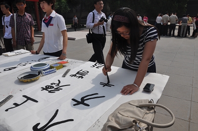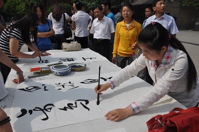 10余名书法专业的学生与碑林博物馆的书法家们进行了书法笔友交流。双方现场泼墨挥毫,互赠书法作品。其中,来自人文学院的研究生李颖、冯秀婷、冀瑾、程健和张晟等同学现场写下了“上得若谷,大方无隅”以及“高山仰止”等作品。笔法苍劲有力,风格迥然各异,赢得现场观众的啧啧赞叹。最后,热情好客的碑林博物馆工作人员带领大家一同参观了碑林博物馆,并讲解了碑刻知识和历史,提高了大家对传统文化的认识,增强了大家的爱国主义精神!