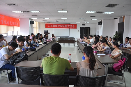 2013年6月4日,一场“人文学院毕业生就业经验交流会”在主楼E703召开。交流会邀请了八位即将毕业并已签好工作或深造的同学,向研一的同学们介绍找工作的经验及建议。出席交流会的领导有人文学院党委副书记马晓彬老师,副书记宋永平老师,以及研究生辅导员于媛芳老师。八位毕业生分别是社会学訾彦锋同学(签河南安阳师范学院教师)、文艺学胡晓楠同学(签中国建设银行浙江湖州分行)、马中化研究李亮同学(甘肃省选调生)、新闻与传播专业李思哲(南京苏宁易购物流有限公司)、艺术设计学专业刘令贵同学(签陕西文化产业投资有限公司)、中国哲学专业黄敏杰同学(考博)、马中化研究曹芳同学(考博)、传播学专业张鏻月同学(英国曼彻斯特大学深造)。