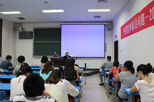 在8日上午开讲的两场讲座中,来自中国社会科学院的霍桂桓研究员、鉴传今研究员以“中国哲学发展走向”为主题同台授课,分别从宏观和微观的角度对中国哲学研究现状、问题以及未来发展走向做了精彩的介绍和分析。霍桂桓研究员首先辨析了“哲学”的基本研究对象,强调哲学研究的问题意识和学科意识是哲学研究者必须具备的基本素养,并且通过对西方20世纪哲学流派和哲学思潮的细致梳理,指出“文化哲学”是未来哲学发展的基本走向;鉴传今研究员则从当前中国哲学的研究现状出发,指出在西方话语的强势冲击下,中国哲学研究不仅存在唯西学马首是瞻的现象,也面临着对现实“失语”的危机,必须提升哲学研究自我创新能力、强化问题意识才能重振中国哲学。