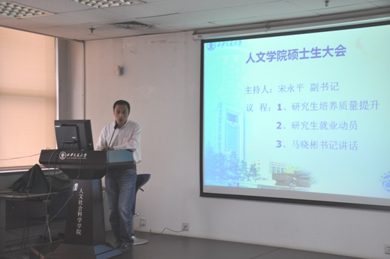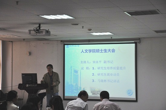 接下来,宋永平副书记向即将毕业的硕士生进行了就业动员。他首先对人文学院2013届毕业生就业情况进行了总结,并指出了人文学院在历年就业中遇到的问题,希望同学们有所借鉴,提前作出就业规划;于媛芳老师对奖学金评定工作进行了介绍。并针对就业问题向大家提出建议,希望大家明确就业方向,保持求职信息畅通,鼓励同学们增强自信心,积极行动。