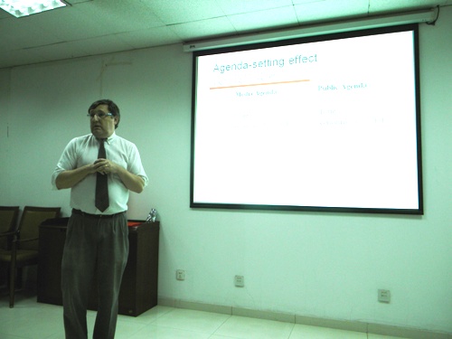 报告中,Wanta教授首先介绍了国际新闻的重要性,之后重点讲解议程设置(agenda setting)理论及其本人所开展的研究,通过实证数据,选择中、日、美、德、俄、印度、巴西等十二个国家为研究对象,展示新闻报道与国家形象认知之间的关系。随后,Wanta教授又以当前常用的社交网络如Facebook,Twitter为例,阐述新闻媒介和国家形象之间的关联及对受众世界认知的影响。最后,对美国佛罗里达大学及新闻学系做了介绍,并重点介绍了该校在人才培养方面的政策和举措,并回答了学生提出的问题。