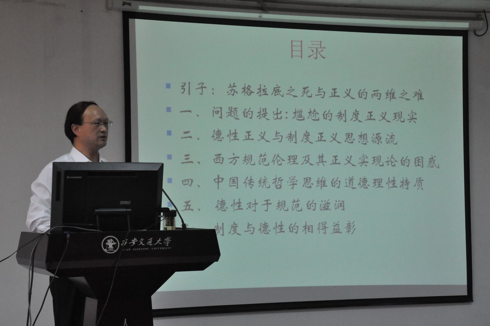 西北政法大学哲学与社会发展学院院长,国家级特色专业负责人,省级重点学科、特色学科带头人,教育部哲学专业教学指导委员会委员,陕西省哲学学会副会长张周志教授应邀作了题为“社会正义的双向维度——超越中西传统哲学德性与制度两分法的思维误区”的专题报告。张教授从苏格拉底之死与正义的两维之难引出报告的主题,并从尴尬的制度正义现实、德性正义与制度正义思想源流、西方规范伦理及其正义实现论的困惑、中国传统哲学思维的道德理性特质、德性对于规范的滋润、制度与德性的相得益彰等六个方面阐述了德性正义与制度正义。