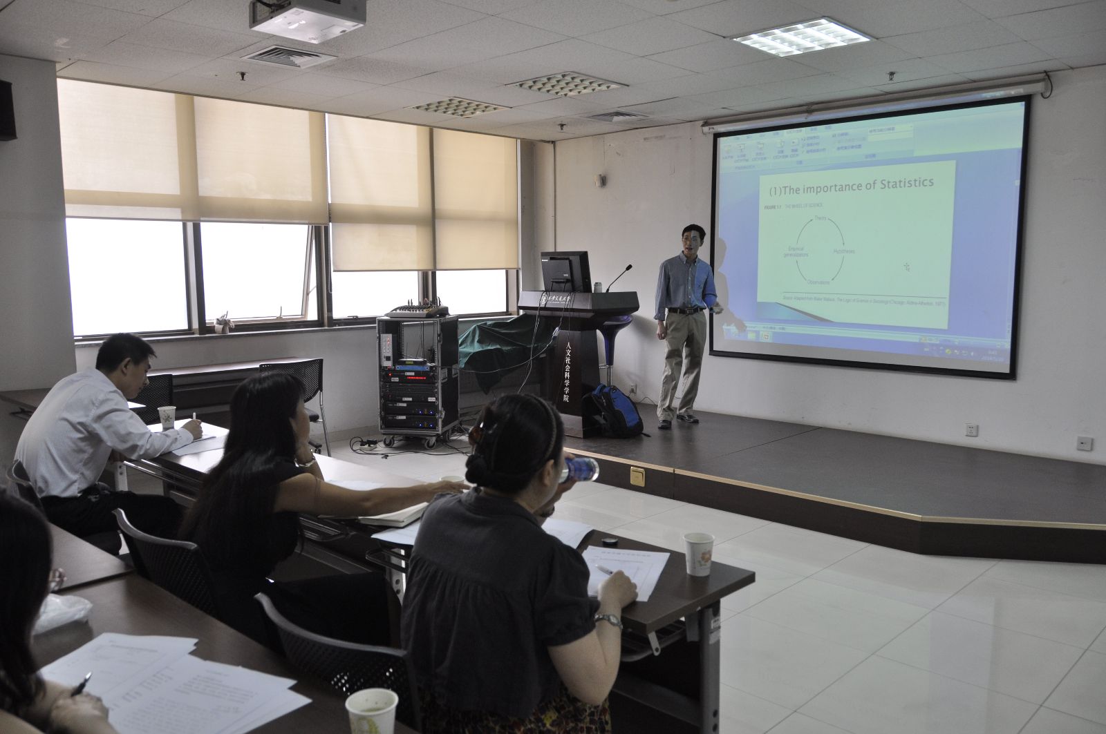 此次报告会,四位老师分别用全英文授课30分钟,内容分别是《定量数据分析导论》、《中国的大众文化》、《自然之诗:19世纪欧洲的风景画》以及《真值表及其应用》。四位老师流利的英语、精美的PPT、巧妙的问题设计、流畅的课堂讲授,以及认真负责的上课态度,给大家留下了深刻印象。