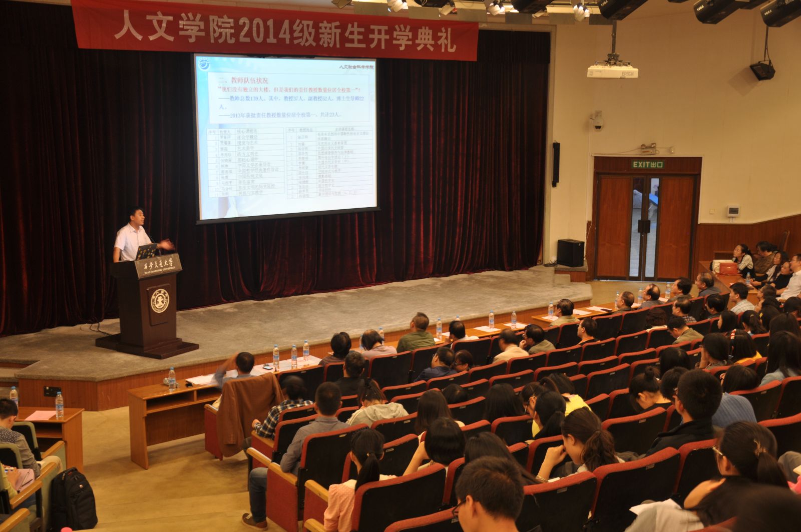 9月13日上午,人文学院2014级新生开学典礼在科学馆101举行。人文学院焦垣生、贾濯非、邬焜、张再林等19位教授以及张帆、李明德、薛养贤、刘儒、范高社、陈学凯等22位系所领导及教师,新生辅导员惠彦渊、新生班主任,学院党委书记马晓彬,副书记宋永平,副院长李黎明、燕连福,院工会主席范高社,院长助理张科、薛卫真出席了新生开学典礼。人文学院全体教辅人员以及260多名新生参加了本次开学典礼。