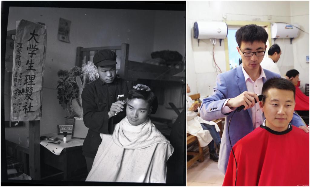 手动推子已被电动设备替代,曾经写着“理发社”的纸张不知何时被卷起,散落不见,以前破旧的理发社也被装修地焕然一新,装了空调,安了长椅。