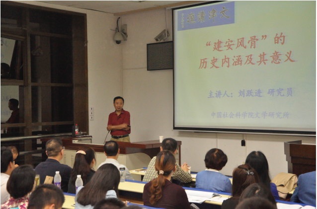 2016年9月26日晚上,主楼A204座无虚席。应人文学院中文系邀请,中国社会科学院文学研究所党委书记、副所长、中华文学史料学会会长、《文学遗产》主编、博士生导师刘跃进研究员作了题为“三曹与建安七子”的学术讲座。此次讲座旨在推动中文系学科建设与发展,扩大文学引领社会风尚、漂洗人们心灵、陶冶人们性情之功效。讲座由人文学院党委书记马晓彬主持,中文系主任李慧教授、罗军凤、李红、姚明今等副教授以及王瑶、许浩然、刘祥、王学强等青年教师出席讲座。