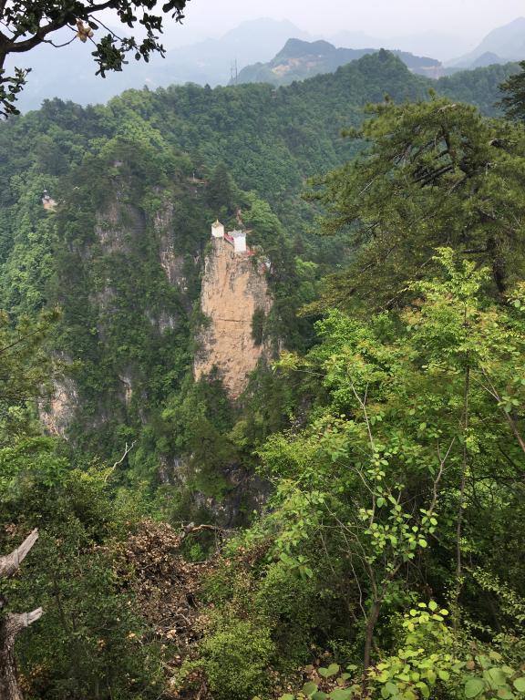 初夏的山中,空气清新,氧气充足,大家欢声笑语,轻松愉悦。 12时多,翻越北翅峰,来到了海拔1665.8米的最高峰塔云金顶。位于金顶的观音殿,三面悬于万丈深渊,是用4根石柱插入石缝,用石条铺垫立基而建,可谓鬼斧神工。经过问道台、太岁洞、揽云栈道、通天梯、福寿亭,翻越南翅峰,沿路中山势奇峭,古松生于石上,山花开于崖间,幽洞隐于山麓,高险幽深,步移景异,变幻无穷。来到南瞻台,形似宝塔,直耸云端的“塔云山”全貌得以展现。险峰、怪石、古松、幽洞、峡谷、密林,与道观建筑相融一体,浑然天成,神秘空灵,宛如仙境。让大家感叹大自然的神奇之余流连忘返,全然没有旅途的疲劳。