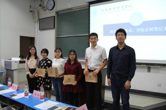 呼和主席讲话结束后,与在场的三位老师、人文学院研究生会王星主席一同为本届研究生会的干事们颁发学院纪念本,授予研究生会纪念章。