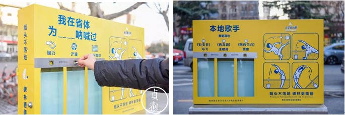 艺术系研究生姚瑶说:“城市最重要的主角应该是人,用烟头投票这样一个小小的方式让人们和这个城市有更多沟通联系,当人们开始认为自己和这座城市有越来越多联系的时候,整个社会环境才能更加的和谐吧。我们采用了采用鲜亮的颜色,在垃圾箱,停车架这样一个小小的单位上使用,或许这会成为西安这座城市整个色彩改变的开始。用小小的行动一步一步接近一个大大的目标,我们正走在前进的路上。”