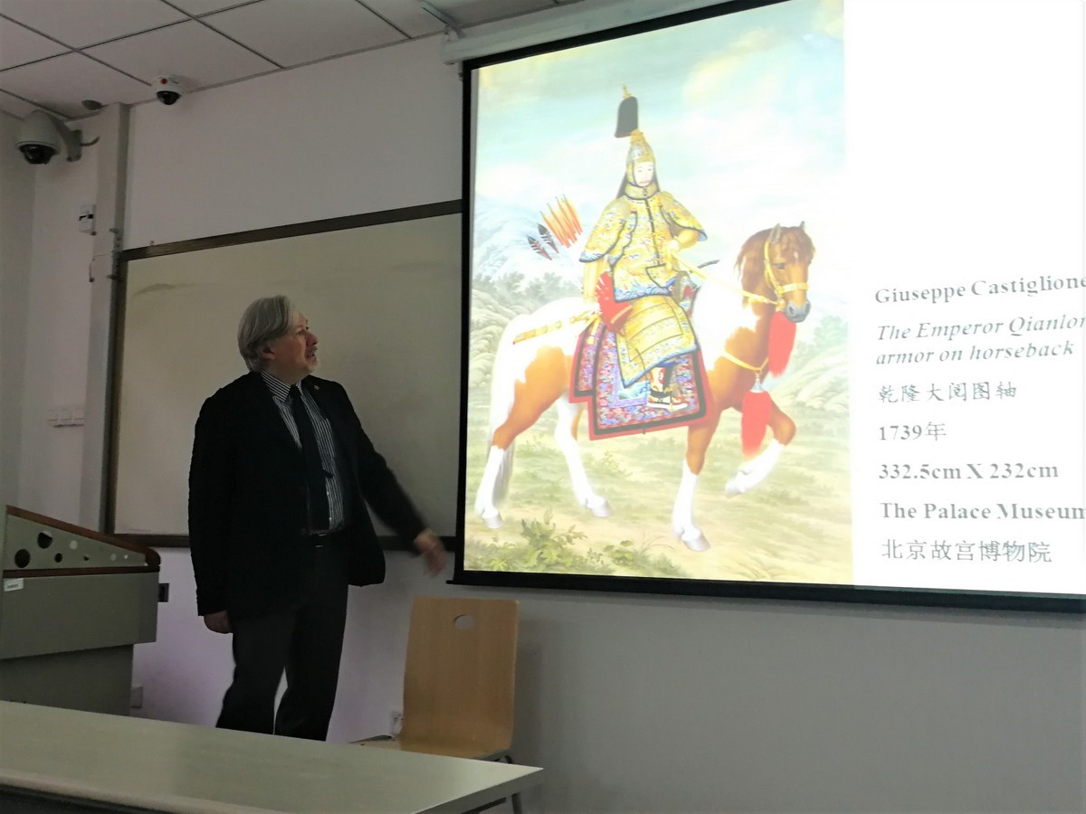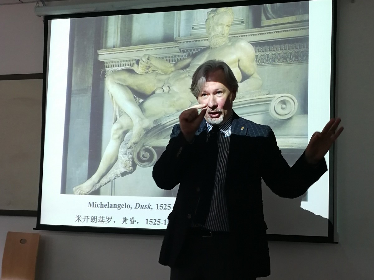 兴庆校区中二-2205教室开讲,课程吸引到校内外数十名师生前来上课。在课堂上,弗朗切斯科•奥西拉院士以米开朗基罗经典艺术作品创作背景为切入点,和大家一起探讨艺术创作与西方艺术哲学的关系。奥西拉院士授课风格幽默风趣,采用互动式教学方法,课堂气氛活跃,首次课程在非常轻松、愉快的气氛下圆满结束。该课程全程以英文教学,配有中文翻译,课程安排在本学期第9-12周周一上午四个课时、周四下午四个课时集中授课,地点:中2-2205教室,欢迎全校师生前来学习交流。