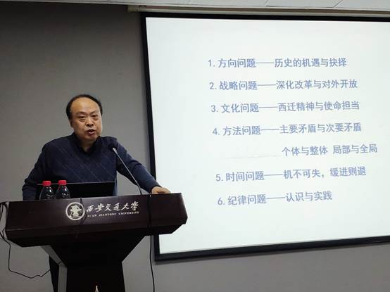 马晓彬书记首先传达了王树国校长工作报告和张迈曾书记总结讲话精神。王树国校长在报告中指出,2018年,交大人拼搏奋进,在弘扬西迁精神、人才培养、科学研究、师资队伍建设、国际合作、社会服务、汇聚发展资源等各项工作中都取得了突出成果,创造了留下历史印记的新贡献。2019年是爬坡过坎的关键一年,交大人要以入驻创新港为契机,不忘初心,砥砺前行,创造更好的成绩。张迈曾书记在讲话中强调,2019年是决定学校发展生死攸关的一年,是决定学校历史新地位的一年,交大人要借鉴他山之石,承担历史责任和时代责任,做好西迁精神新传人,继续加强党的建设、抓好“双一流”建设、抓好综合改革、抓好扩大合作、推进创新港建设、抓好作风建设,更加解放思想、改革开放,再一次创造历史印记新贡献。