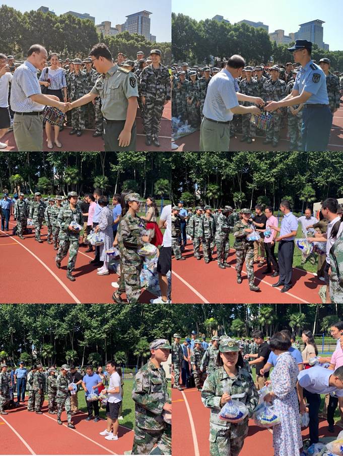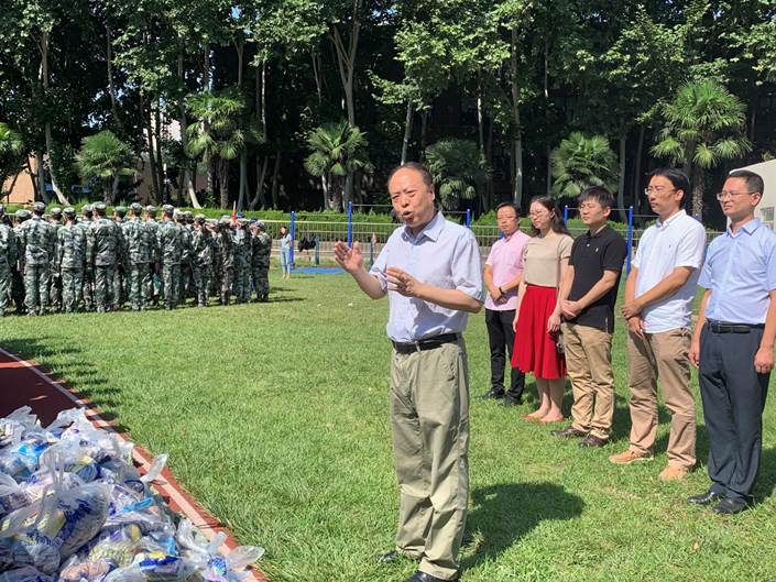 王劲副书记一一介绍了前来慰问的学院领导、各系老师及班主任,并对刚步入大学校园的新生寄以最美好的祝福。随后学院领导及各系老师、班主任向教官和学生发放慰问品,并向教官表示感谢。
