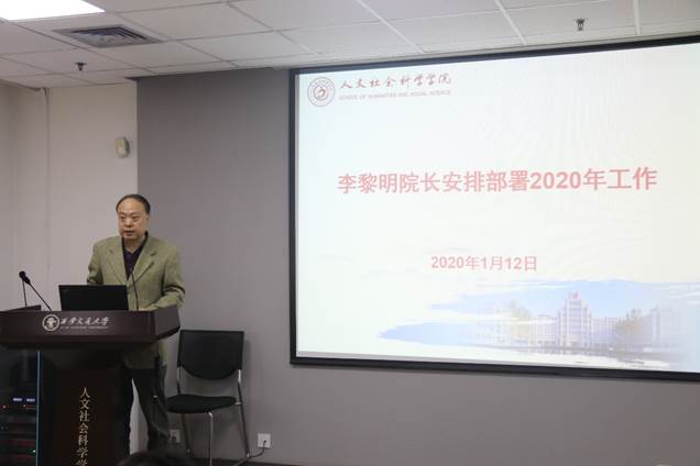 1月12日上午,人文学院在主E703召开会议,传达学校寒假工作会议精神,安排部署学院2020年工作。大会由院长李黎明主持,院领导、党委委员、全体教授、系主任、副主任、教工党支部委员参加会议。