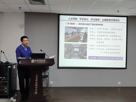 学院党委书记许佳辉首先传达了学校主题教育总结大会上张迈曾书记和中央第一指导组黄宪起代表的讲话精神。接下来,许书记对人文学院“不忘初心、牢记使命”主题教育开展情况进行总结。人文学院按照中央和学校安排部署,认真开展主题教育。领导干部通过自学和集中研讨,学习的自觉性和系统性得到加强。党员通过“新时代新阅读”坚持理论学习,同时结合庆祝建国70周年组织观影和参观活动,提升了学习效果。领导班子成员通过集体座谈、调查问卷、个别访谈、企业座谈等方式,围绕学院中心工作,开展了扎实细致的调研工作,同时针对调研中发现的创新港空间问题、博士生身心健康等问题,立行立改,成效明显。在检视问题阶段,领导干部多措并举查找问题,分级分类梳理问题,并认真召开了对照党章党规找差距会议。同时,把整改落实作为重要环节,群众关注的民生问题立即改,调查反映的突出问题重点改,真正通过主题教育解决了一些困扰学院发展的问题。各党支部在主题教育开展阶段,举办了“纪念章里话初心”活动,走进省政府参与政务公开,走进合作企业参与座谈等特色活动,并且发挥学科优势,开展下乡支教、关注弱势妇女和自闭症儿童等志愿活动,真正体现了党员师生关注社会,勇挑使命的担当意识。