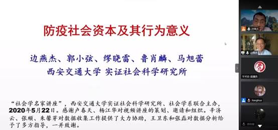 5月22日晚上8点,社会学系与学术志平台合作开启线上“西安交大社会学名家讲座”第三讲,由实证社会科学研究所所长、明尼苏达大学终身教授边燕杰带领其学生团队分享最近研究——《防疫社会资本及其行为意义》。
