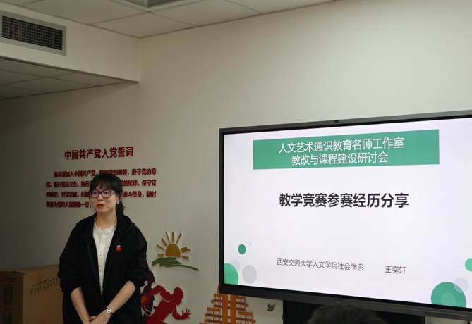 社会学系王奕轩副教授就自己参加陕西省教学创新大赛的经历和收获进行了分享。王老师通过自己的备赛经验,强调要改变对教学比赛的态度,以赛促学,注重细节,不怕吃苦。王老师以自己的选题“交叉性理论”引出在选题方面要做到具体而完整,尽量能全方位展示课程思政、教学形式创新等方面。王老师强调赛教设计、课件制作、教案撰写等细节方面,都要注意将“以老师为中心”的理念转变为“以学生为主导”。在课程思政方面,王老师提到可以将案例与现实结合,将思政思想有机地贯穿教学过程中。