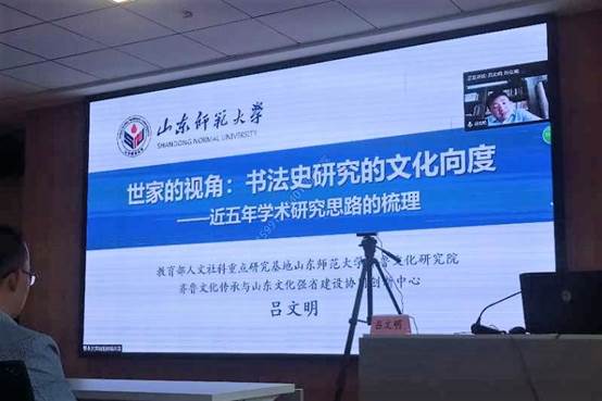 入选国家万人计划青年拔尖人才、泰山学者青年专家、山东省第四批齐鲁文化英才、山东省第二批签约艺术批评家、中国书法家协会会员、中国文艺批评家协会会员、山东省书法家协会主席团委员兼教育委员会主任、山东师范大学齐鲁文化研究院副院长吕文明教授以“世家的视角——书法史研究的文化向度”为题带来精彩报告,旨在引导大家条理清晰、有的放矢地进行书法史研究,从“世家”视角出发为学术观察开拓全新思路。他以扼要的语言、详实的例证,从沙孟海与蒋维崧二先生所提“文史哲学问基础”入手探讨当下学生论文中普遍所存问题,围绕自身研究方向的“博”与“专”展开探讨,特别就其对书法世家视角的选择、学术视野的提升、文化向度的拓展等问题进行深度剖析,结合个人研究经验分享科研过程的苦与乐,并提出作为书法学人的多方面思考。