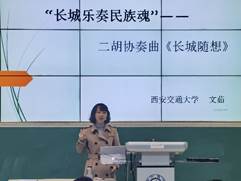 本次课程采用全国直播互动见面课的模式,由西安交大人文学院音乐教育中心文茹老师主讲。课堂上通过二胡协奏曲《长城随想》创作时的一段令人难忘的特殊情缘引入课程内容,从《长城随想》的精神内涵、《长城随想》的民族神韵、“中西融合”的音乐体裁、“雅俗共赏”的音乐语言和“传统与创新”相互交融的创作理念对作品进行了全方位的解读。