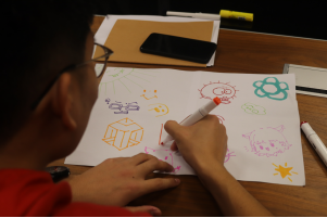随后,全班同学共同创作了一副名为《抗“抑”》的涂鸦,大家利用彩笔,在同一张纸上画出各自内心的一个元素,并对这一元素进行简要解释。最终的涂鸦作品营造了一个非常丰富的世界,五颜六色、多姿多彩。图中有照亮阴霾的太阳,希望世界充满爱的爱心,代表抑郁症的鬼脸,期待心有所属的老鼠以及祝愿生活充满甜味的冰激凌等。同学们把内心对抑郁症的抗议表现在了纸面,不吝表达对温馨的环境、美好的心情之向往。通过这次涂鸦,大家分享了祝福,真正收获了当下的欢乐与满足,也加深了各自对抑郁症的认识,使得大家的友情得到了存留与延续。