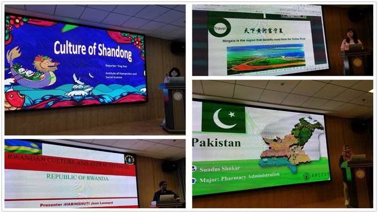 首先,来自山东、巴基斯坦、卢旺达和宁夏的4名中外学生通过PPT的形式向大家展示了自己的家乡。国际学生介绍了自己国家的文化、美食、风俗习惯,以及自己国家与中国的经济文化交流;国内学生选择从自己家乡著名的点切入,展开介绍了当地的特色传统文化、历史传承。