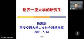 7月12日下午至13日上午,人文学院为入营学子准备了三场主题宣讲与讲座。硕0116党支部书记倪蒙同学为同学们带来“传承西迁精神,不负伟大时代”的主题宣讲。倪蒙同学用幽默风趣的语言为大家讲述交大从上海迁至西安的历史,分享西迁过程中的感人故事。他希望每位同学都能从西迁精神中汲取能量,为中华民族的伟大复兴做出自己的贡献。贾濯非教授以“海外文物寻踪与数字化复原”为题展开讲座。贾教授首先为大家明确了“海外流散文物”的定义,以圆明园、敦煌石窟、山西洪洞广胜寺为例,讲述了我国珍贵文物流散的现状,并指出这不仅仅是文物本身的流失与破碎,更重要的是文物背后文化内涵的流失。因此,数字化复原对文物与文化研究十分重要。边燕杰教授向同学们作了“世界一流大学的研究生”专题讲座,以美国大学为例,指出世界一流大学的特点以及学术分类的国际标准,并从三个方面对同学们的科研安排提出了建议。最后边教授鼓励大家“主动挑战自我,增加理论困惑,争当拔尖创新,瞄准世界一流”,成为优秀的世界一流大学对的研究生。