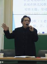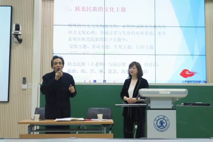 此次专题以国家非物质文化遗产陕北民歌为主题,系统讲述了陕北民歌的历史文化构建过程以及独特的音乐美学特征。王老师演唱的高亢婉转、直白热烈、充满烟火气的陕北民歌,鲜活而生动,使学生对这一古老的民间艺术有了更加完整、深入、感性的认识。在课堂的互动环节中,学生们以流行歌曲对阵王老师的陕北民歌,唱出不同时代人的喜怒哀乐、甜酸苦辣,现场冲击巨大,别有一番趣味。此外王老师还为学生们讲述了陕北民歌的革命化历程,并演绎了《东方红》由民间歌曲到革命民歌的转化过程,学生们无不感慨民间艺术的博大与包容。