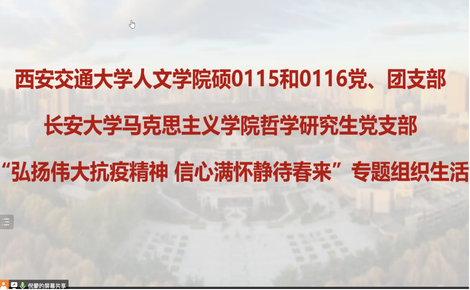 人文学院硕0115和0116党支部书记倪蒙和长安大学马克思主义学院哲学研究生党支部书记代博分别介绍了两支部的基本情况、过去一年工作总结以及抗疫工作情况。