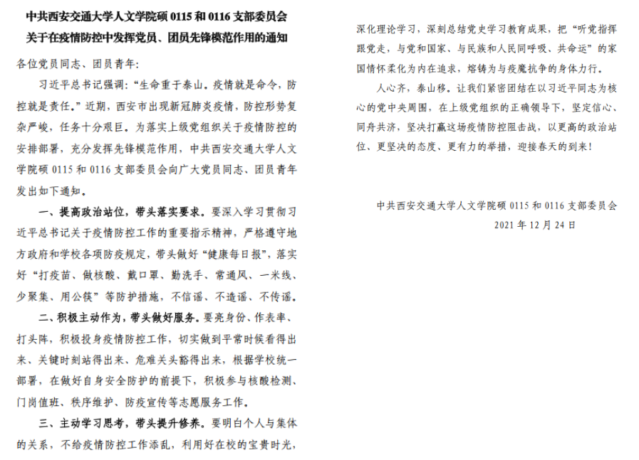 人文学院硕0115和0116支部委员会关于在疫情防控中发挥党员、团员先锋模范作用的通知》,强化人文关怀,鼓励成员响应学校号召,在疫情防控一线亮身份、树旗帜、担使命、守初心。