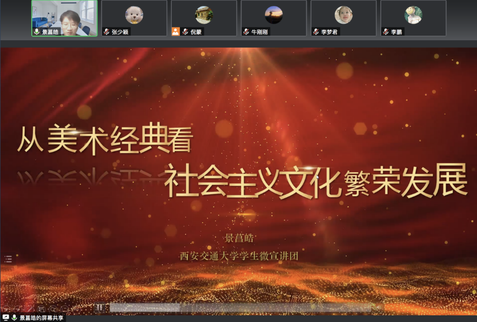 学生微宣讲团成员景菖皓围绕《从美术经典看社会主义繁荣发展》这一主题,为支部成员深入讲解了党的十九届六中全会精神。他结合电影、绘画等多形式爱国主义题材艺术作品,讲述了用出色的作品彰显爱国主义精神,不仅是过往经典所作所为,更是年轻人继往开来的风向所指。