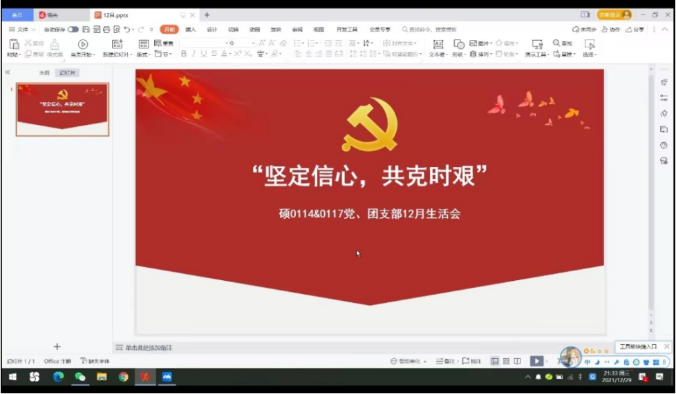 12月29日,人文学院硕0114和0117党、团支部开展“坚定信心,共克时艰”组织生活会,学习习近平总书记在中国文联十一大、中国作协十大开幕式上的讲话和在中央经济工作会议上的讲话。受疫情影响,会议在线上召开,党支部书记邹铭聪主持会议,赵惜晨、蒋悦、杨紫嫣向大家分享学习内容。