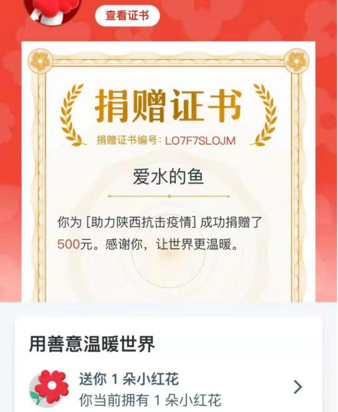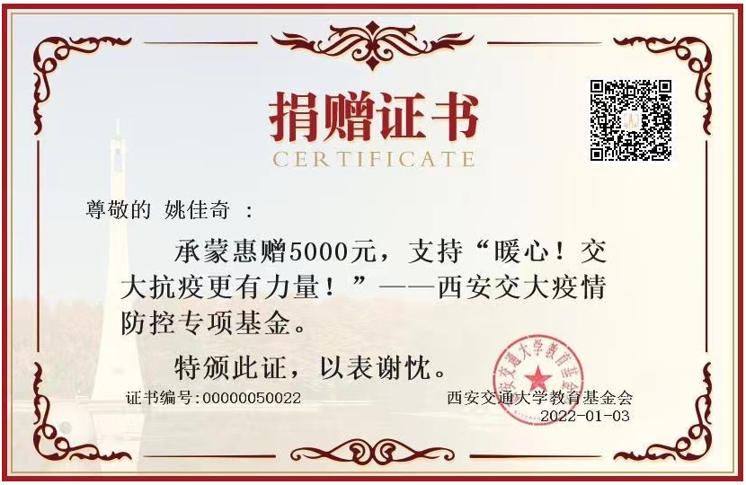今年是姚佳奇在西安上学的第七年,西安于她而言已是第二个家,捐款是她目前能贡献的微薄之力。每一笔捐款都是一颗爱心,汇聚在一起就是一份份希望,让西安人民充满信心,让防疫人员更有力量与病毒作斗争。在捐款的过程中她感受到了各方的关爱,付出爱心的同时也收获了爱心;同时也更坚定了她不忘初心砥砺前行的决心。