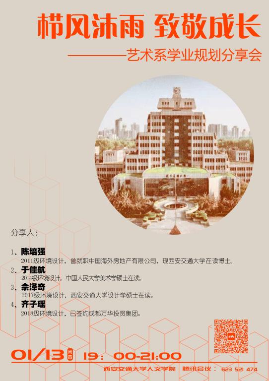 次日,举行应届毕业生和几个优秀校友的经验分享,包括佘泽奇(2017级环境设计专业,西安交大设计学硕士在读)、齐子瑶(2018级环境设计专业,已签约成都万华投资集团)、于佳航(2014级环境设计专业,中国人民大学美术学硕士在读)和陈培强(2011级环境设计专业,曾就职中国海外房地产有限公司,现 161sex