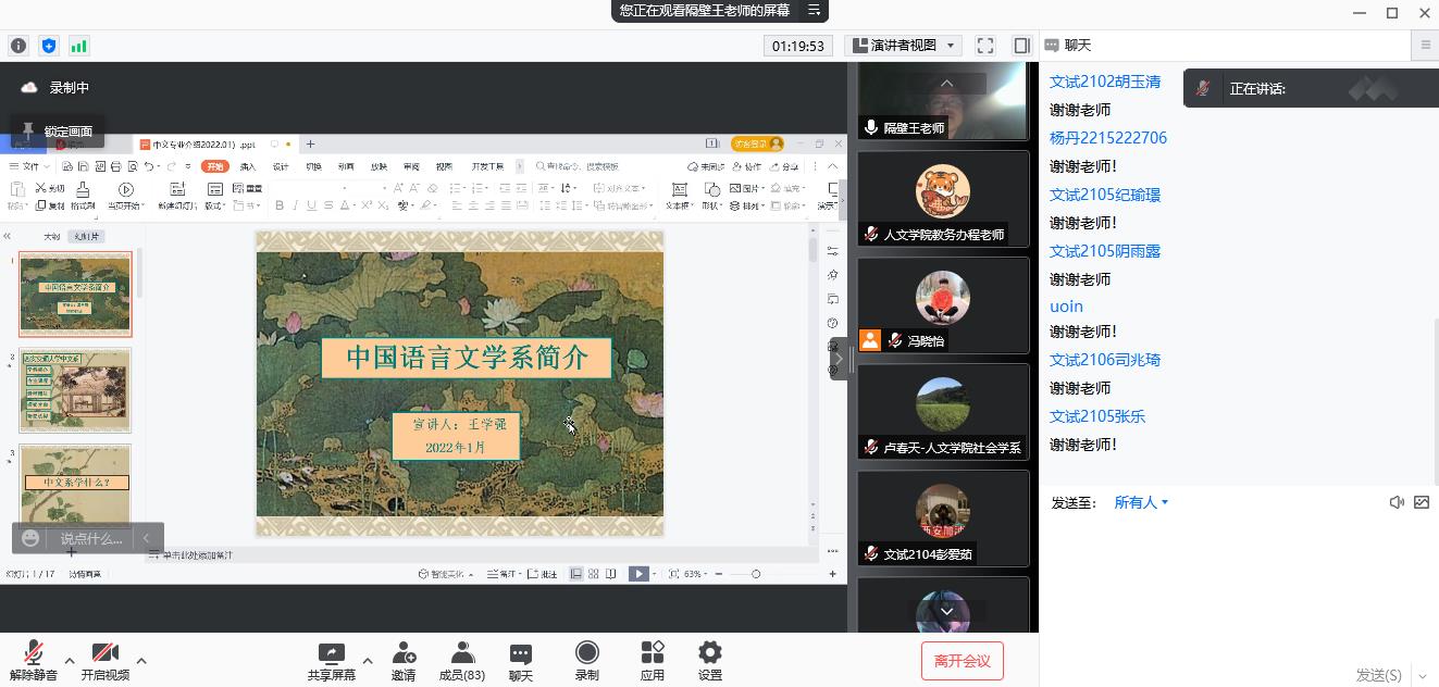 1月10日晚,人文学院面向大一本科生举办了两场线上专业认知教育活动讲座,参加此次活动有哲学、社会学、汉语言文学、环境设计和书法学五个本科专业。