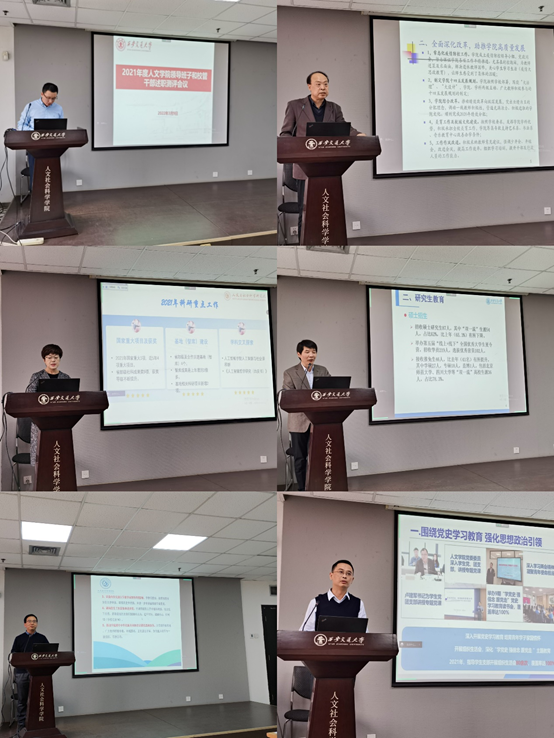 最后,李黎明、许佳辉对学院2022年重点工作进行安排部署。2022年学院要继续以党建工作为抓手,在学院营造良好的文化氛围。推进落实“十四五”规划,以学科建设为牵引,着力于高层次和骨干人才建设,加强青秀人才和学科博士后引进,构筑人才集聚高地。结合第五轮学科评估结果,凝练专业发展方向,提升学科建设水平。服务国家发展需求,以3个省部级以上智库基地建设为抓手,建设文科特色智库。以“铸牢中华民族共同体意识”为主题推进人文社科类课程思政改革,落实“立德树人”,全面提高人才培养能力。