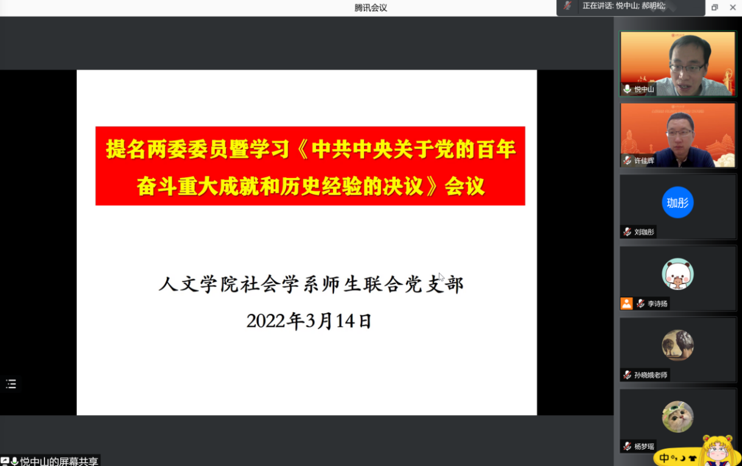 为深入领悟《中共中央关于党的百年奋斗重大成就和历史经验的决议》(简称《决议》),更加坚决捍卫“两个确立”,做到“两个维护”,3月14日,社会学系师生联合党支部举办了《决议》专题学习会。会议由支部书记悦中山主持,全体师生党员参加,人文学院党委书记许佳辉莅会指导。